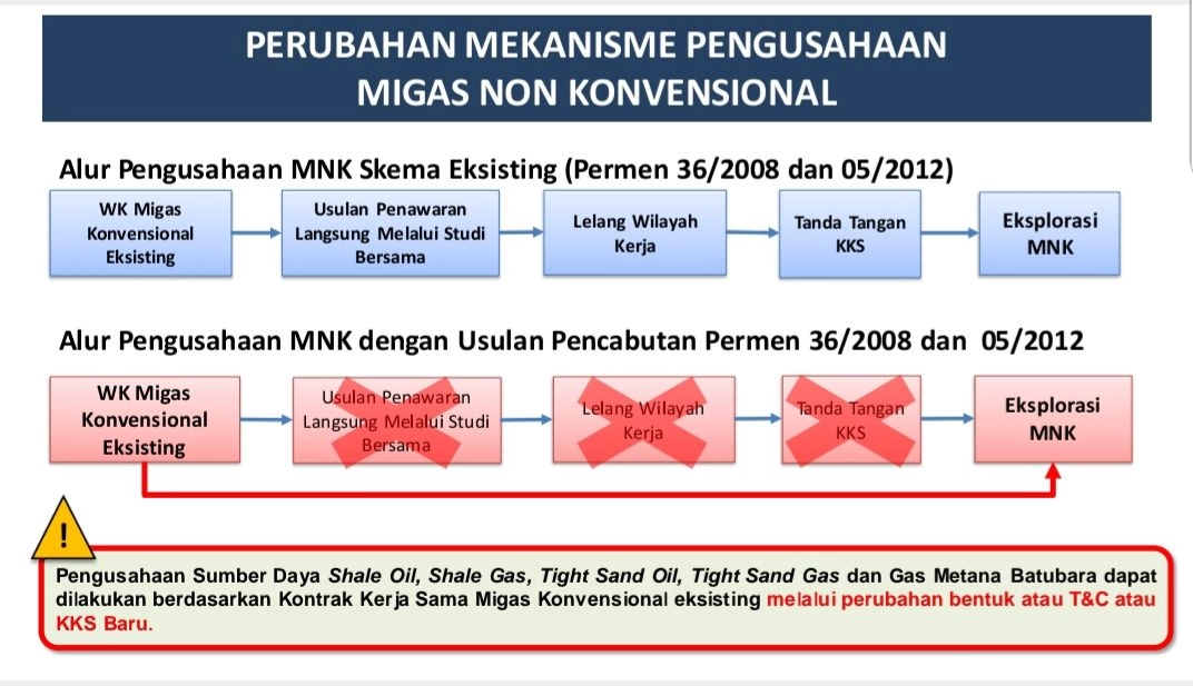 Terkait perubahan mekanisme pengusahaan MNK, diatur dalam aturan ini bahwa pengusahaan sumber daya shale oil, tight sand oil dan gas metana batubara (GMB) dapat dilakukan berdasarkan kontrak kerja sama migas eksisting melalui perubahan bentuk atau term and conditions atau kontrak kerja sama baru.
