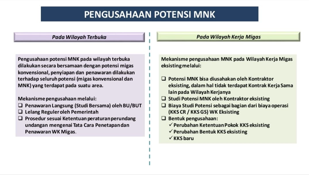 Sementara mekanisme pengusahaan WK migas eksisting melalui potensi MNK bisa diusahakan oleh Kontraktor eksisting dalam hal tidak terdapat kontrak kerja sama lain pada WKnya. Selain itu, studi potensi MNK oleh Kontraktor eksisting, biaya studi potensi sebagai bagian dari biaya operasi WK eksisting. Terakhir, bentuk pengusahaan yaitu perubahan ketentuan pokok KKS eksisting, perubahan bentuk KKS eksisting dan KKS baru. (Sumber: Humas Ditjen Migas)