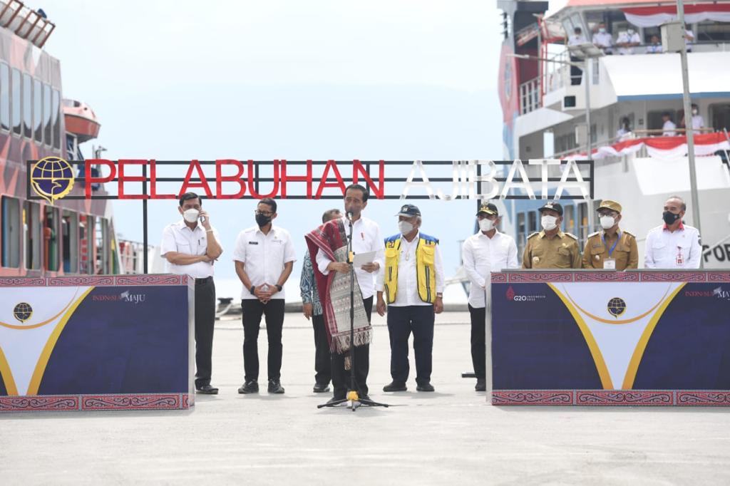 PEDOMAN.id – Presiden Joko Widodo meresmikan tujuh pelabuhan penyeberangan dan empat kapal motor penumpang (KMP) di Kawasan Dermaga Pelabuhan Ajibata, Kabupaten Toba, pada Rabu, 2 Februari 2022. Presiden berharap pelabuhan penyeberangan dan KMP yang telah diresmikan dapat mendukung keberadaan Danau Toba sebagai salah satu destinasi wisata unggulan di Tanah Air.