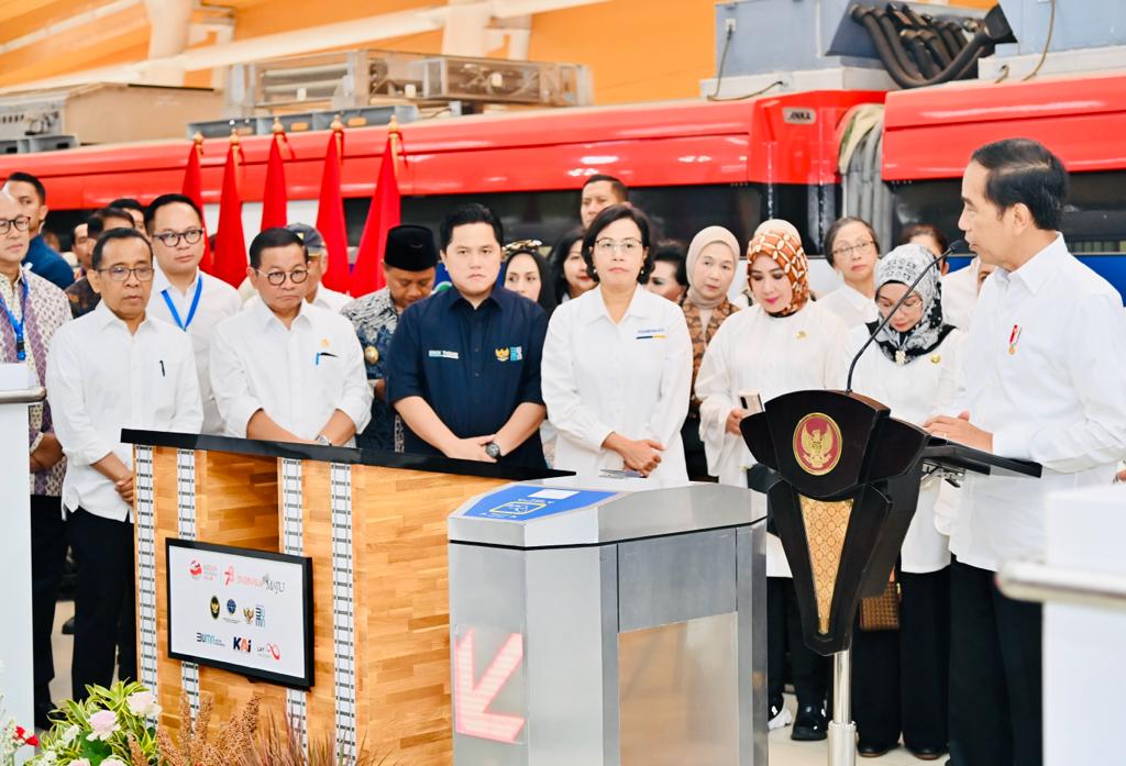 PEDOMAN.id – Presiden Joko Widodo meresmikan moda transportasi kereta api ringan Lintas Rel Terpadu (LRT) Jakarta-Bogor-Depok-Bekasi (Jabodebek) di Stasiun LRT Cawang, Jakarta pada Senin, 28 Agustus 2023. LRT sepanjang 41,2 kilometer tersebut dibangun dengan menghabiskan anggaran Rp32,6 triliun.