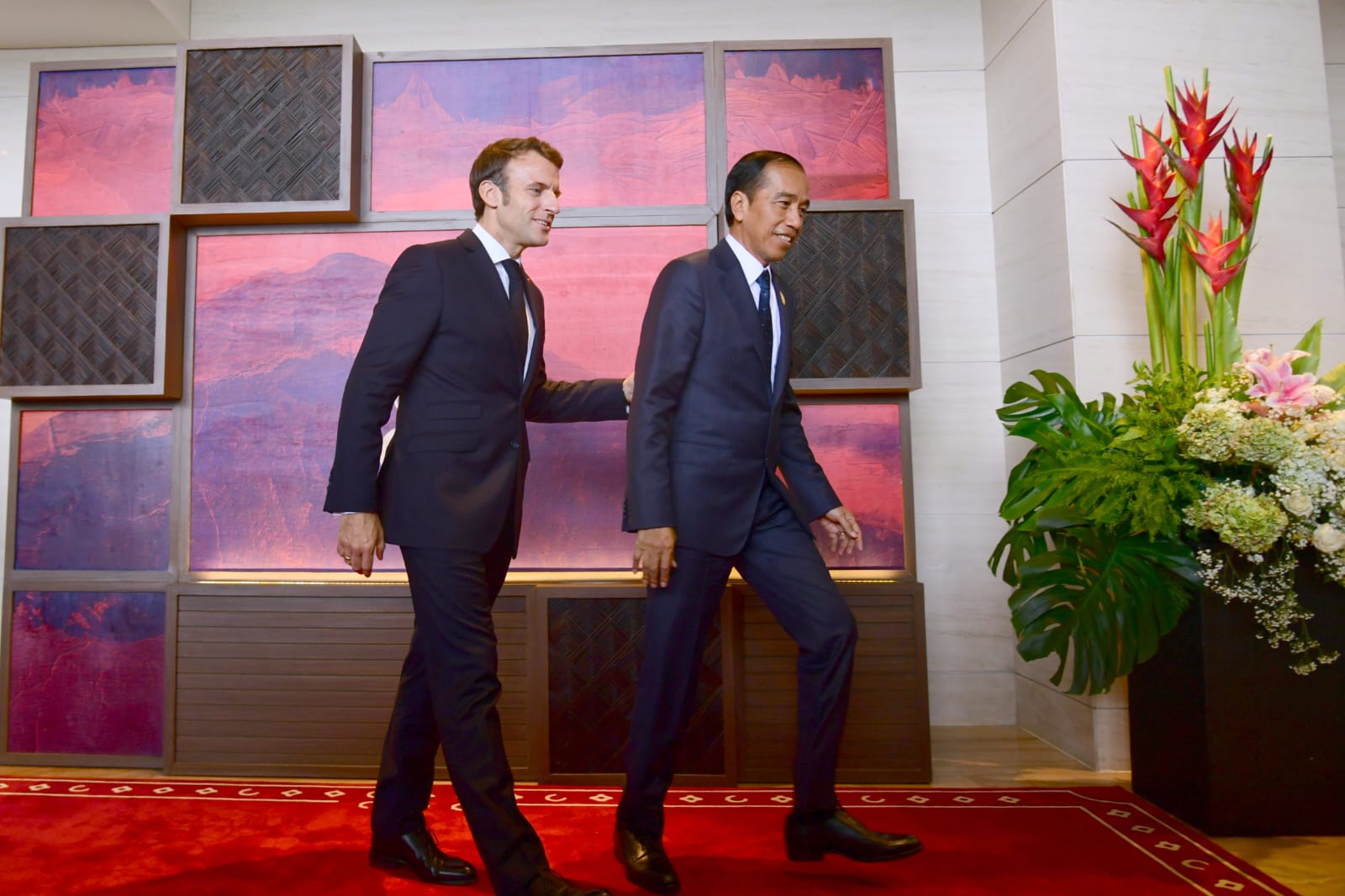 “Presiden Macron, selamat datang di Bali. Terima kasih untuk kehadiran Yang Mulia pada KTT G20 ini serta dukungan Prancis sepanjang Presidensi Indonesia. Walaupun situasi dunia sedang tidak kondusif saat ini, kita terus bekerjasama agar G20 dapat menghasilkan kerjasama yang bermanfaat bagi semua,” ucap Presiden.