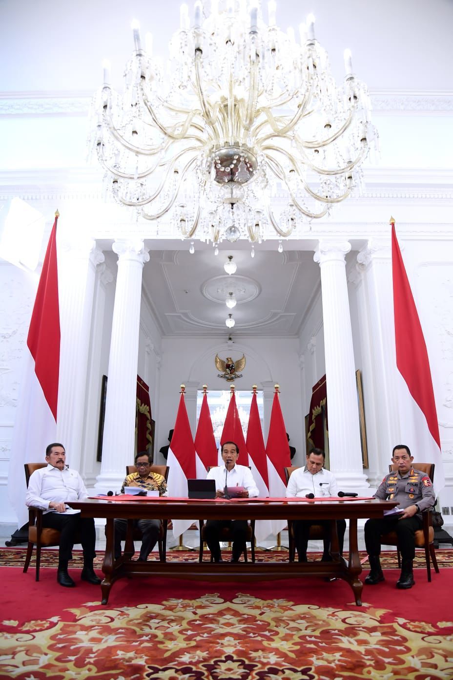 Turut mendampingi Presiden Jokowi dalam kesempatan tersebut yaitu Menteri Koordinator Bidang Politik, Hukum, dan Keamanan Mahfud Md., Kapolri Jenderal Listyo Sigit Prabowo, Jaksa Agung St. Burhanuddin, dan Ketua Komisi Pemberantasan Korupsi (KPK) Firli Bahuri. (Sumber: BPMI Setpres)