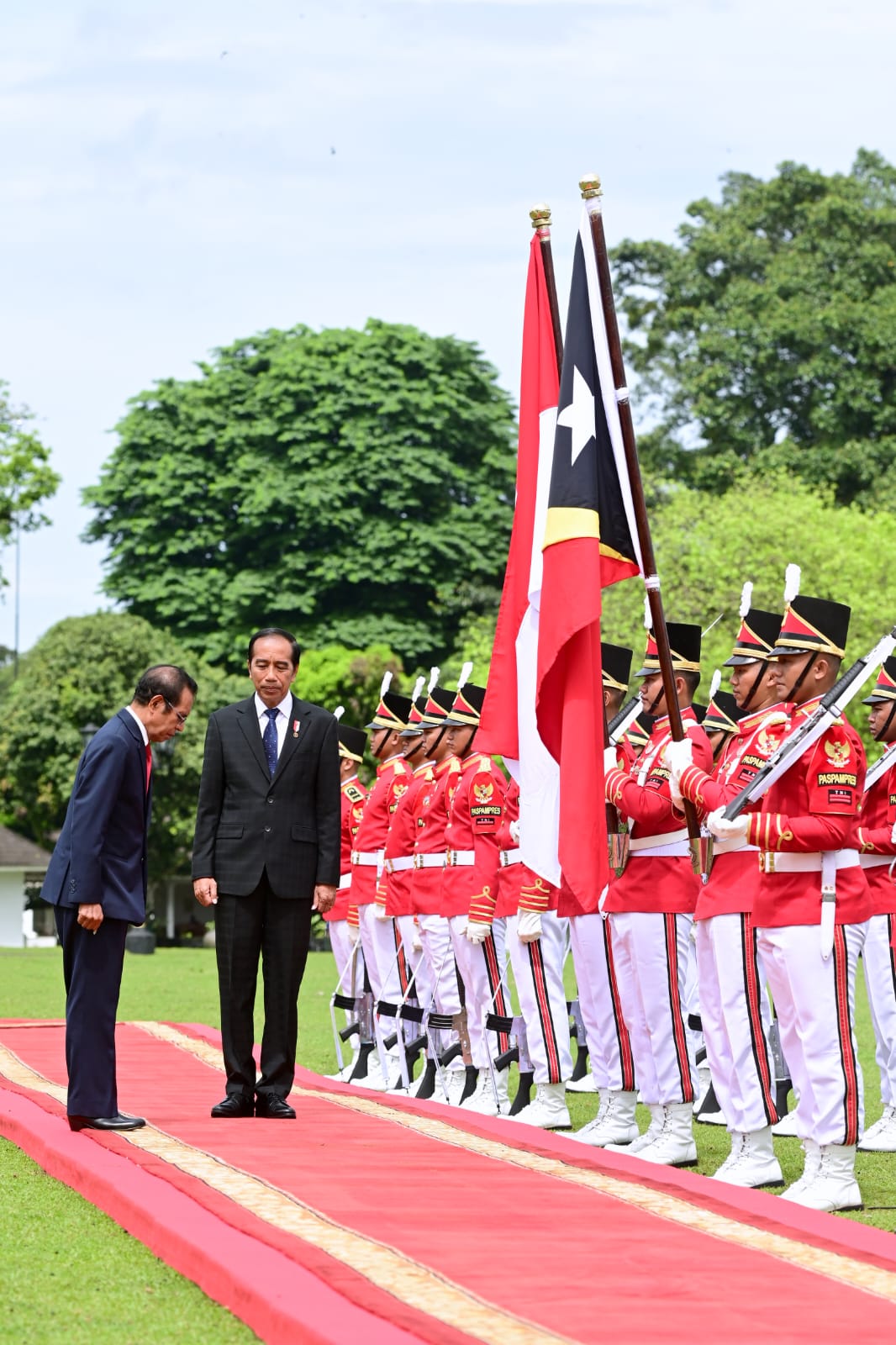 PEDOMAN.id – Presiden Joko Widodo menyambut kunjungan resmi Perdana Menteri (PM) Republik Demokratik Timor-Leste, Taur Matan Ruak, di Istana Kepresidenan Bogor, Kota Bogor, Provinsi Jawa Barat, pada Senin, 13 Februari 2023.Tiba sekitar pukul 10.00 WIB, kedatangan PM Timor-Leste turut diiringi oleh pasukan Nusantara, pasukan berkuda, dan korps musik Pasukan Pengamanan Presiden (Paspampres).