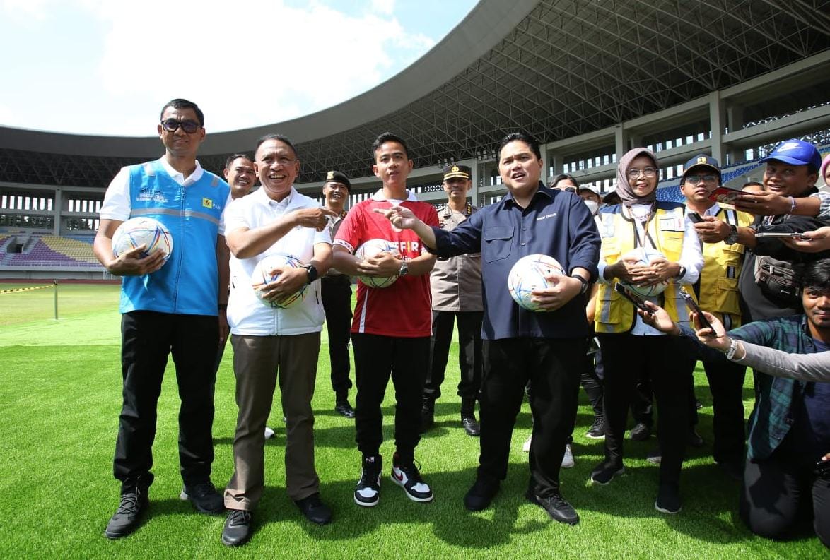 PEDOMAN.id – Ketua Umum PSSI, Erick Thohir didampingi Menteri Pemuda dan Olahraga (Menpora) Zainudin Amali, Wali Kota Solo, Gibran Rakabuming Raka, Direktur Utama PT PLN (Persero) Darmawan Prasodjo, dan Direktur Prasarana Strategis Kementerian Pekerjaan Umum dan Perumahan Rakyat (PUPR) Essy Asiah mengecek kesiapan Stadion Manahan Solo yang akan menjadi salah satu tempat perhelatan Piala Dunia U-20, Minggu (12/03).