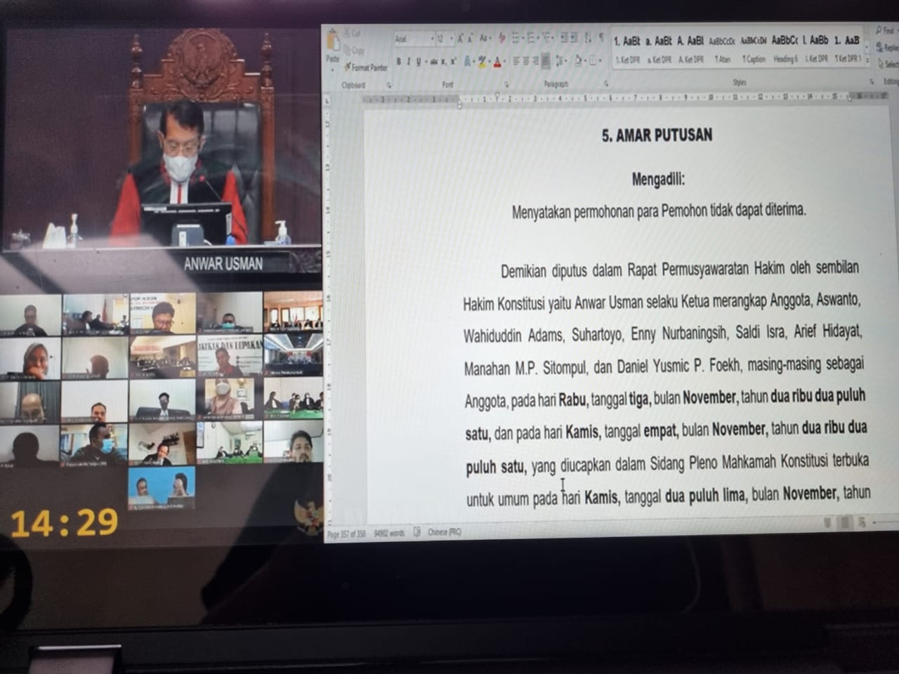 Berikut poin penting Sidang Putusan Judicial Review UU Cipta Kerja pada Kamis (25/11/2021) yang disiarkan melalui chanel Youtube Mahkamah Konstitusi RI sebagai berikut: