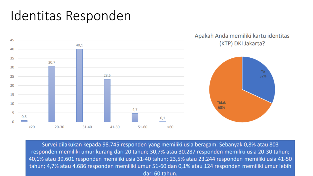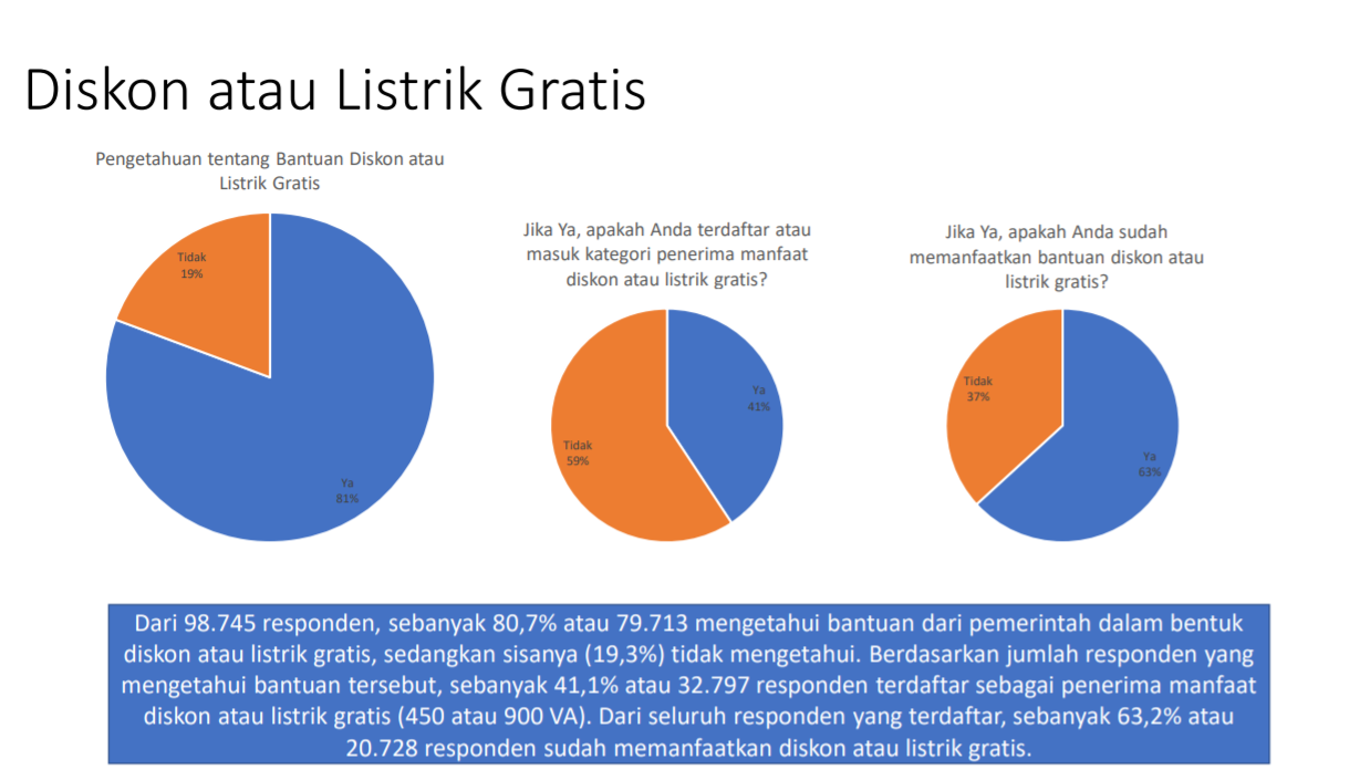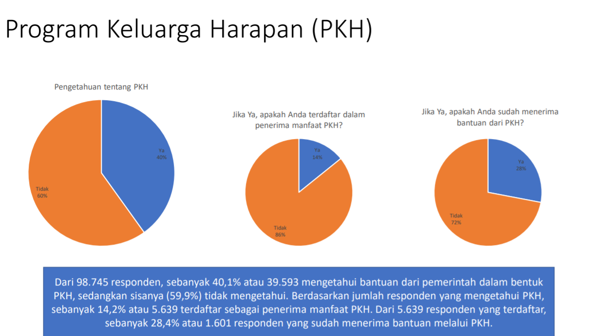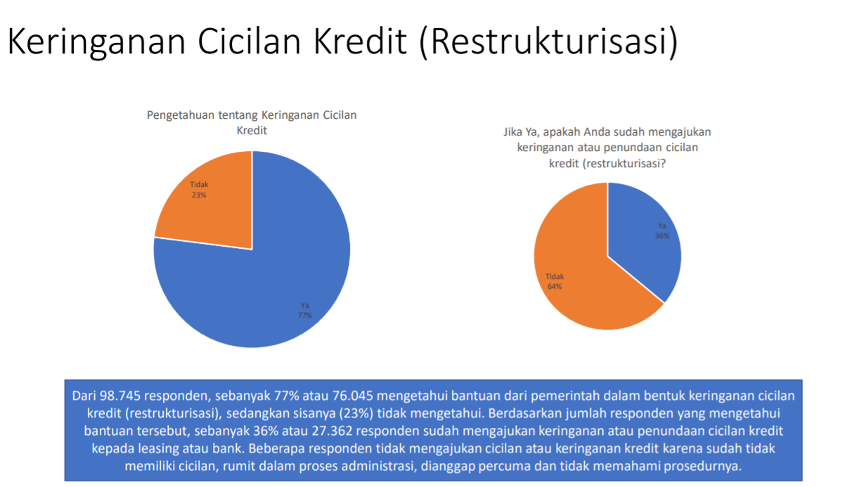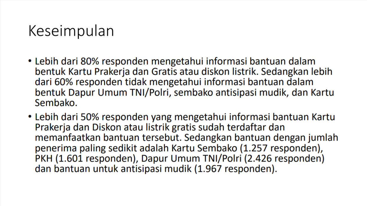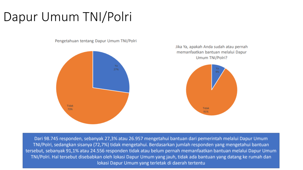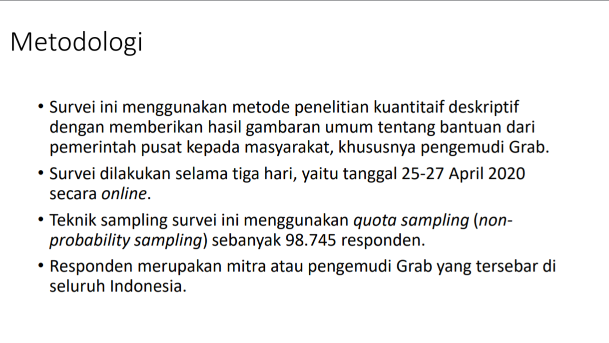• Survei ini menggunakan metode penelitian kuantitaif deskriptif dengan memberikan hasil gambaran umum tentang bantuan dari