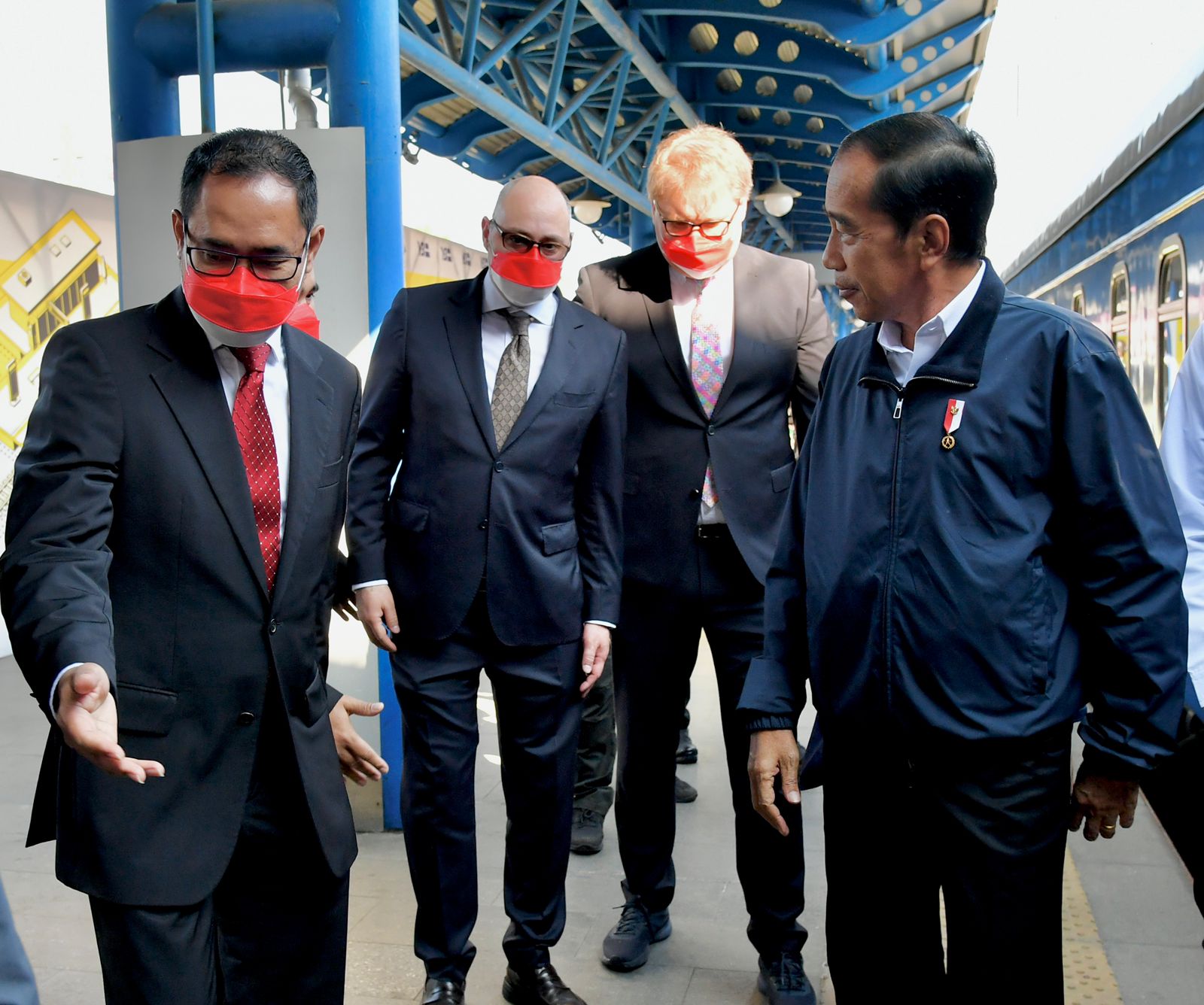 Setelah pintu gerbong kereta terbuka, Presiden dan Ibu Iriana turun dari kereta disambut oleh Deputi Menteri Luar Negeri Ukraina Dmytro Senik, Kepala Komisi Hubungan Antar Pemerintah Ukraina-Indonesia Taras Kachka, dan pejabat KBRI Kyiv.