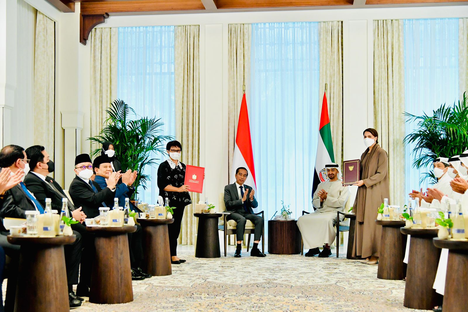 PEDOMAN.id – Presiden Joko Widodo dan Presiden Persatuan Emirat Arab (PEA) Sheikh Mohamed bin Zayed bin Sultan Al Nahyan menyaksikan pertukaran dokumen IUAE-CEPA (Indonesia-United Arab Emirates Comprehensive Economic Partnership Agreement) yang telah disepakati kedua negara di Istana Al Shatie, Abu Dhabi, 1 Juli 2022.