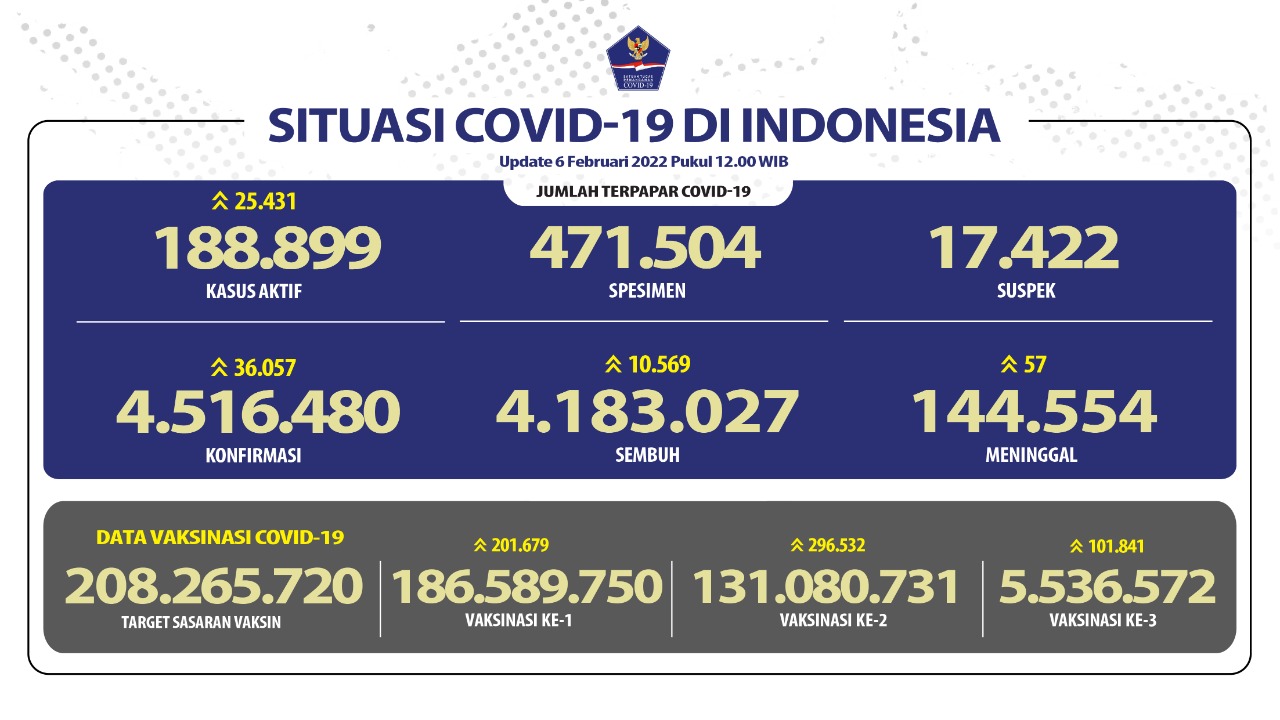 Untuk jumlah orang yang diperiksa per hari ini ada 265.599 orang dan kumulatifnya 50.201.467 orang. Lalu pada hasil terkonfirmasi negatif jumlah kumulatifnya meningkat menjadi 45.684.987 orang termasuk tambahan hari ini sebanyak 229.502 orang. Sementara positivity rate (NAAT dan Antigen) orang harian di angka 13,58% dan positivity rate orang mingguan (30 Januari – 5 Februari 2022) di angka 8,32%. Secara sebaran wilayah terdampak masih berada di 34 provinsi dan 510 kabupaten/kota.