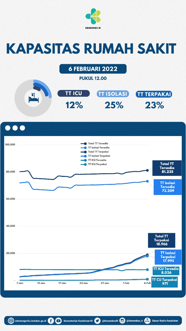 PEDOMAN.id – Per hari ini (6/2) pukul 13.00, secara nasional, jumlah pasien COVID-19 yang dirawat di rumah sakit berjumlah 18.966. Dengan kata lain, tingkat keterisian BOR nasional saat ini masih 23,35% dari 81.235 kapasitas tempat tidur COVID-19 yang tersedia.