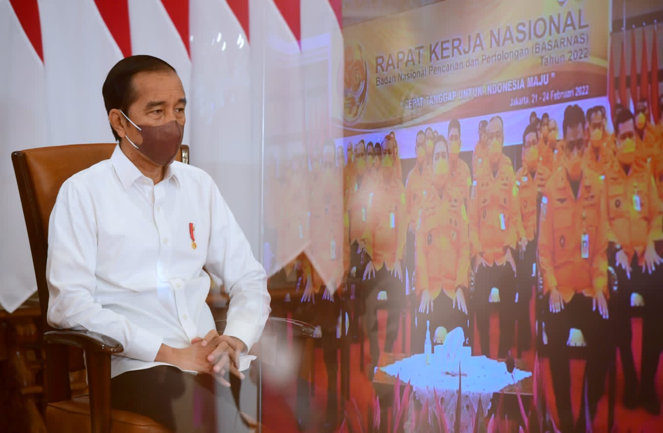 PEDOMAN.id – Presiden Joko Widodo membuka secara resmi Rapat Kerja Nasional (Rakernas) 50 Tahun Emas Badan Nasional Pencarian dan Pertolongan (Basarnas) yang digelar melalui konferensi video di Istana Negara, Jakarta, pada Senin, 21 Februari 2022. Dalam sambutannya, Presiden mengucapkan selamat sekaligus terima kasih atas pengabdian Basarnas dalam membantu masyarakat yang tertimpa musibah.