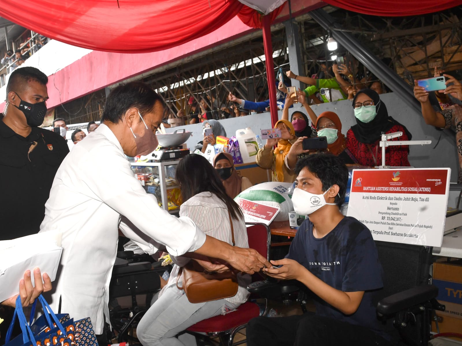 Di sana, Presiden dan Ibu Iriana memberikan sejumlah bantuan dan berinteraksi dengan beberapa masyarakat penerima manfaat serta pedagang. Salah satu pedagang yang juga kaum disabilitas bernama Joko menyampaikan apresiasi atas bantuan yang diberikan dan berharap bantuan tersebut dapat meningkatkan usahanya di bidang makanan.
