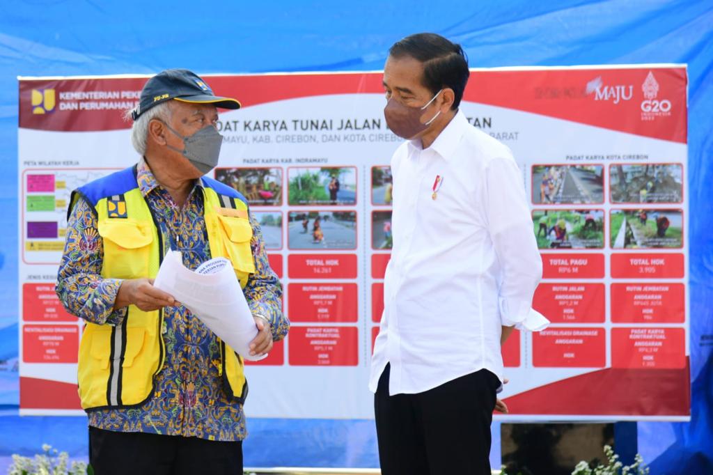 PEDOMAN.id – Presiden Joko Widodo meninjau kegiatan padat karya tunai jalan dan jembatan yang dilakukan di Kelurahan Panjunan, Kecamatan Lemahwungkuk, Kota Cirebon, pada Rabu, 13 April 2022. Kegiatan padat karya tunai tersebut mencakup pengerjaan pemeliharaan taman dan sarana pedestrian jalan.