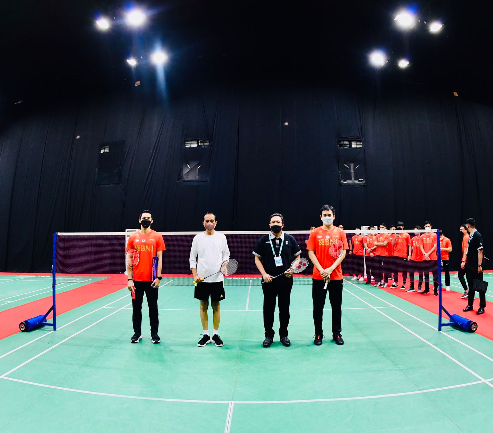 Bertanding di lapangan latihan, Presiden Jokowi tampak berpasangan dengan atlet tunggal putra, Jonathan Christie. Keduanya bertanding melawan Hendra Setiawan yang berduet dengan Ketua Umum Persatuan Bulu Tangkis Seluruh Indonesia (PBSI), Agung Firman Sampurna.